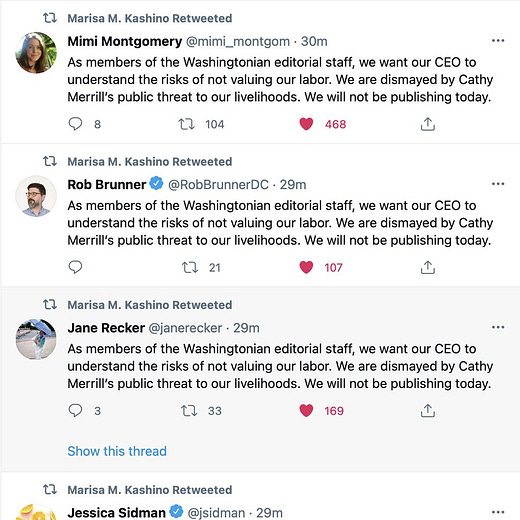 “We deserve a say in what our daily lives look like,” a separate staffer told me when I asked what they hoped would come out of this op-ed mess. “We spend a lot of our weekly hours working for this place. We give so much of ourselves to this company, shouldn’t we have a say in what our working lives look like?”