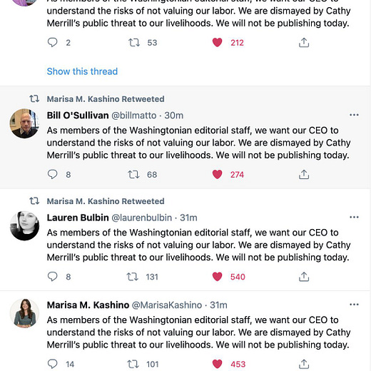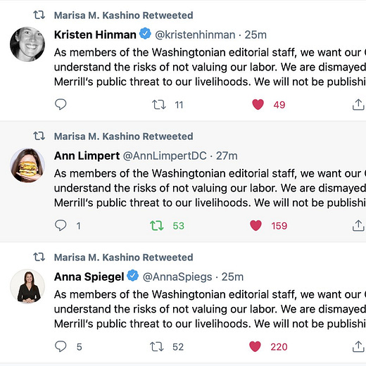 Part of that hard work, employees told me, involved covering an unusual amount of unrest in the nation’s capitol where staffers were teargassed and frequently in harm’s way. “It has been a really difficult year for the city we cover, Andrew Beaujon, a senior editor at the magazine told me. “And we’re not complaining — we feel privileged to do this work but it’s it’s not an easy job. And that’s made this op-ed all the more shocking.”